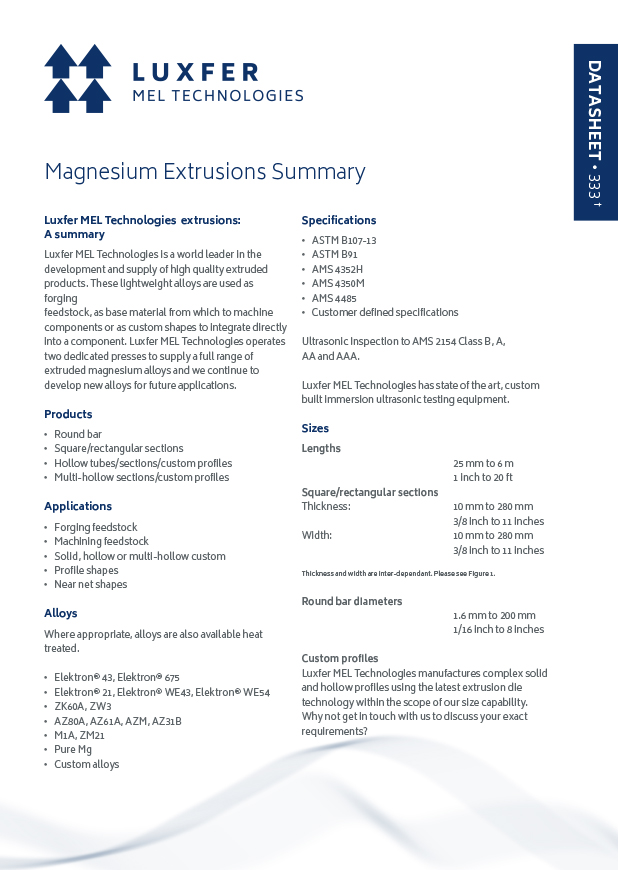 Lightweight magnesium alloys – We operate two dedicated presses to supply a full range of extruded magnesium alloys and we continue to develop new alloys for future applications.