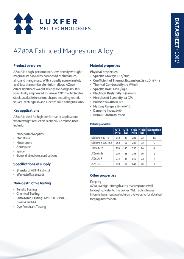 AZ80A Extruded Magnesium Alloy – With a density approximately 30% less than similar aluminium alloys, AZ80A offers significant weight savings for designers. It is specifically engineered for use as CNC machining bar stock, available in various shapes including round, square, rectangular, and custom solid configurations.