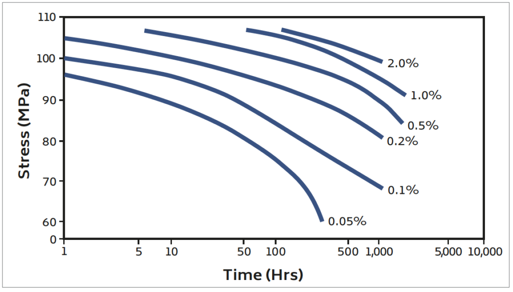 Figure 4. Stress / time relationship for specified creep strains at 100˚C.