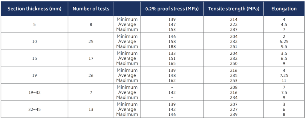 Table 1. Cut up properties on samples taken from actual castings.