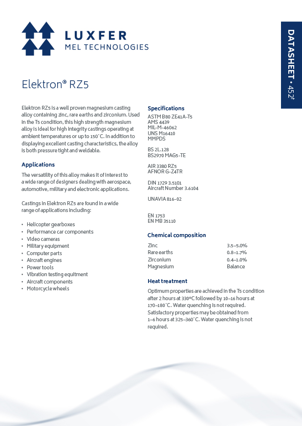 The versatility of this alloy makes it of interest to a wide range of designers dealing with aerospace, automotive, military and electronic applications. Castings in Elektron RZ5/ZE41A are found in a wide range of applications including: