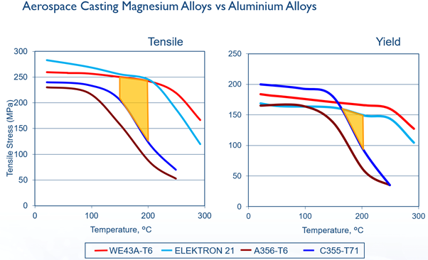 For applications operating in the temperature range of 150 ˚C to 200 ˚C, cast Elektron® 21 and Elektron® WE43B offer a lighter alternative to the aluminum alloys such as A356 and C355. The density of magnesium is 66% of aluminum enabling significant weight savings to be achieved.