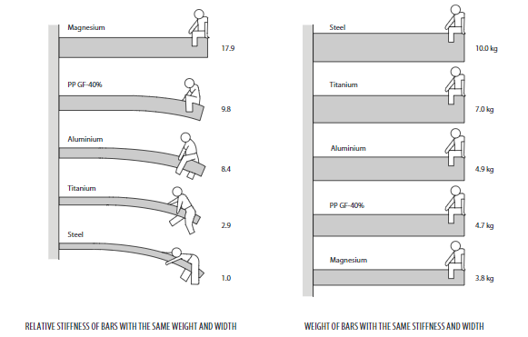 Similarly, on the basis of equal rigidity, a magnesium section need weigh only 75% of the aluminium one, or when compared on the basis of equal weight the magnesium will be twice as stiff.