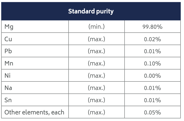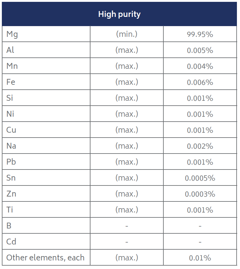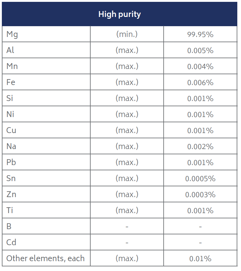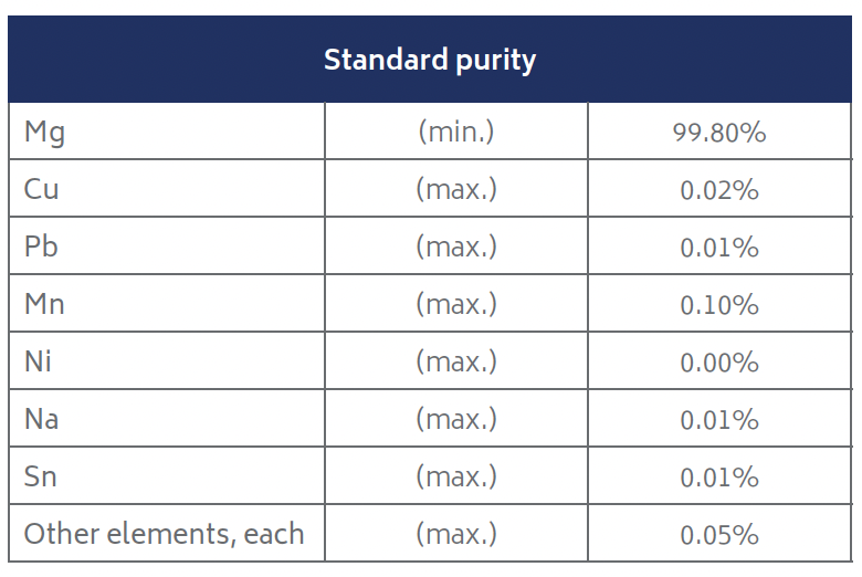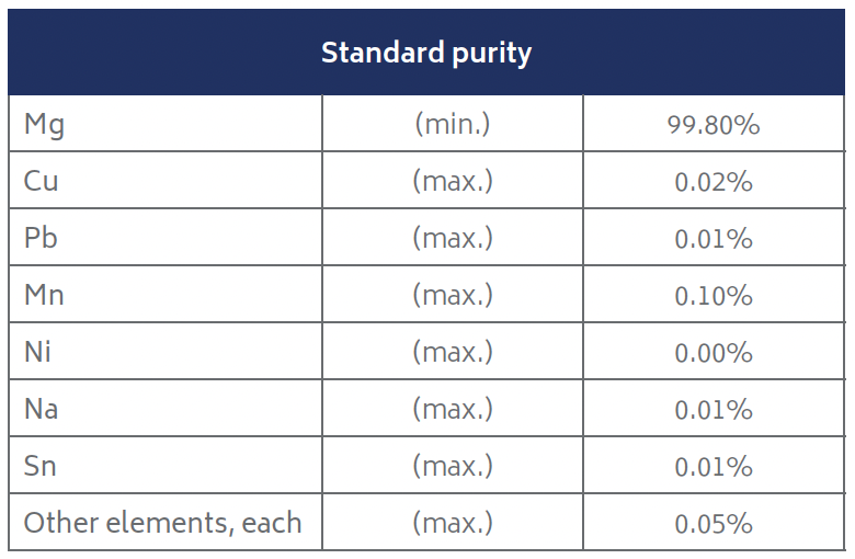 Products are processed from primary magnesium ingot, the chemical composition of which conforms to ASTM B92-17 Grade 9980A.