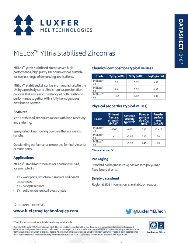 MELox stabilised zirconias are manufactured in the UK by a precisely controlled chemical precipitation process that ensures consistency of both purity and performance together with a fully homogeneous distribution of yttria.