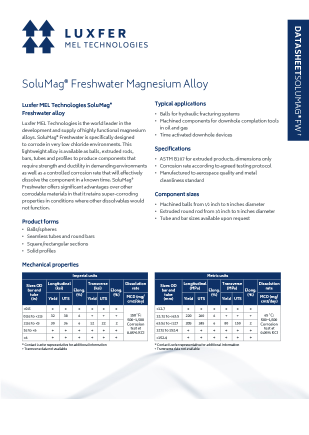 This lightweight alloy is available as balls, extruded rods, bars, tubes and profiles to produce components that require strength and ductility in demanding environments as well as a controlled dissolution rate that will effectively dissolve the component in a known time.