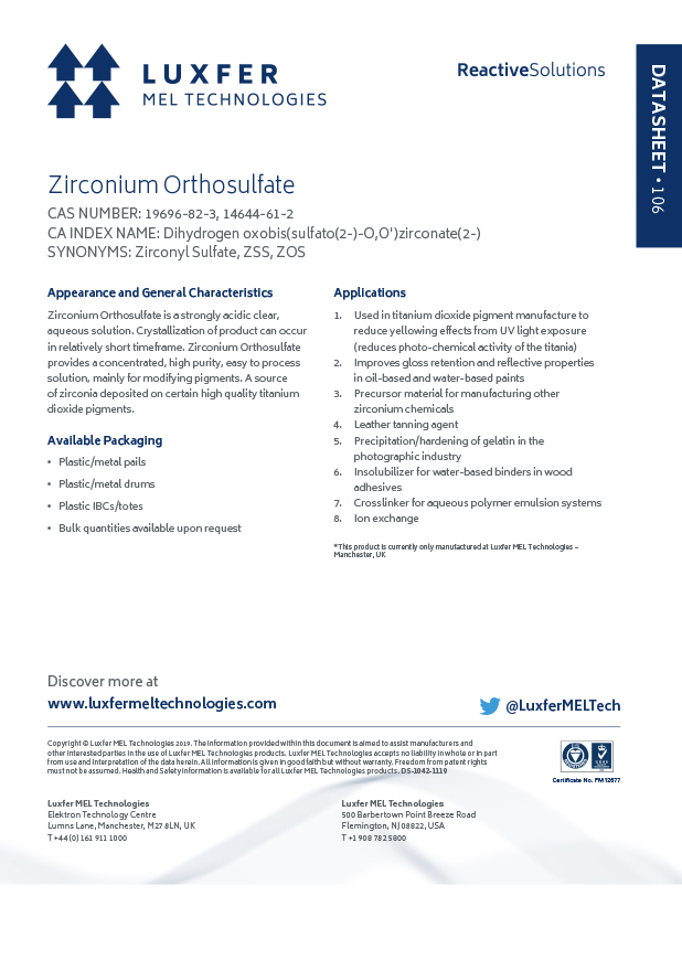 Zirconium orthosulfate is a strongly acidic clear, aqueous solution used in manufacturing titanium dioxide pigments to reduce yellowing effects from UV light exposure. Additionally it is used for softening leather and as a degreasing agent.